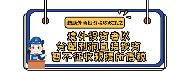 为充分发挥税收支持稳外贸稳外资工作的职能作用,国家税务总局对现行有效的相关税收支持政策和征管服务举措进行梳理更新,形成新版《稳外贸稳外资税收政策指引》并于1月15日对外发布。为方便纳税人更好了解政策、适用政策,为外贸外资发展营造良好税收环境,江苏税务将持续开展稳外贸稳外资税收政策系列专题宣传,今天带您了解境外投资者以分配利润直接投资暂不征收预提所得税。