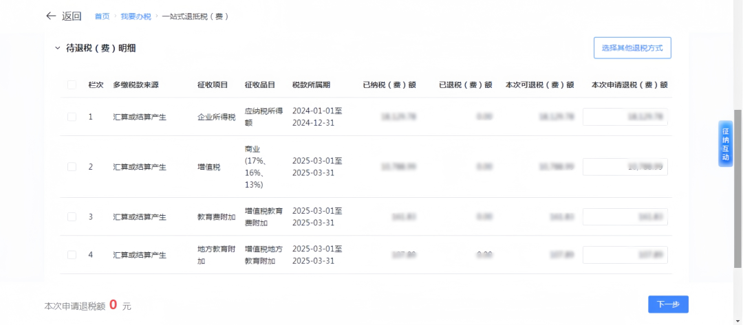 勾选并确认需要退库的多缴税款,填写“退税申请理由”后点击“下一步”,根据要求提交附报资料后提交退库申请即可。