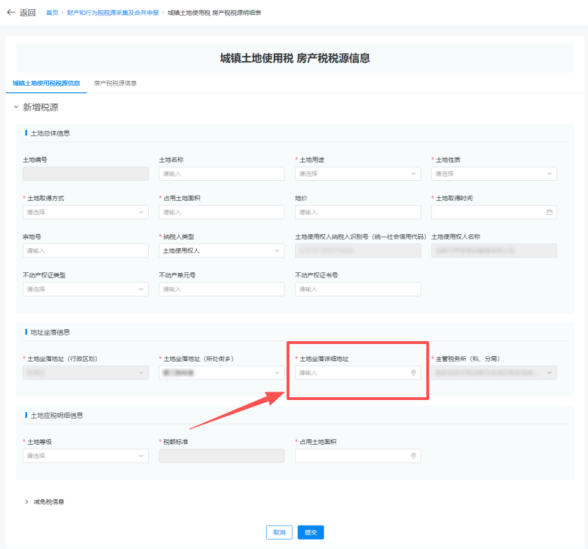 点击卡片上的【税源采集】,跳转到城镇土地使用税明细表界面。自动带出已有土地信息。