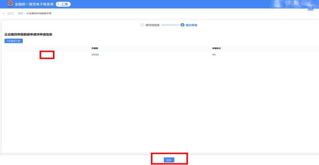 勾选刚刚填写好的撤回申请数据,点击 “提交” 按钮。