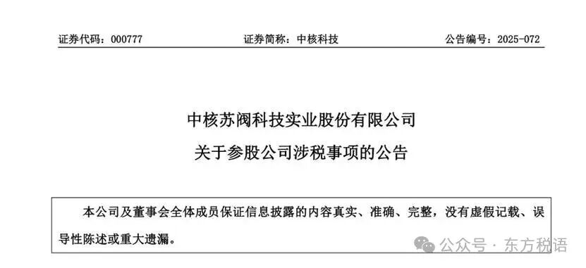 中核苏阀科技实业股份有限公司(以下简称“公司”)参股公司深圳市中核海得威生物科技有限公司(以下简称“海得威”)近日补缴 2021 年 1 月 1 日至 2024 年 12 月 31 日企业所得税、增值税等税费 1.88 亿元及滞纳金,合计约 2.71 亿元,主要涉及海得威前述年度期间的销售费用、存货非正常损失等事项,不涉及行政处罚。