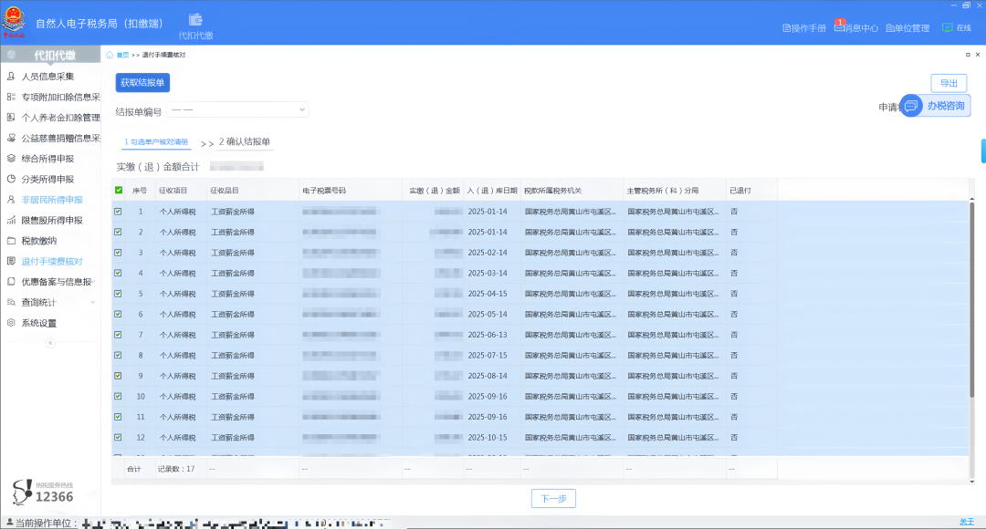 点击左侧菜单“退付手续费核对”,进入“退付手续费核对”界面,系统自动弹出确认信息提示框,点击【我知道了】,系统自动带出单户核对清册。
