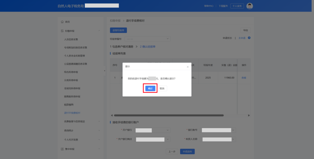6.核对退付金额无误后,点击【确定】。完成后系统将推送至税务机关及国库审核,审核通过后,申请的手续费将退到扣缴义务人办理退付手续费时选择的银行账户内。