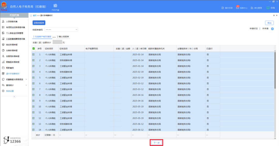 4.系统自动带出单户核对清册。核对单位2025年度扣缴税款信息,核对无误后,点击【下一步】。