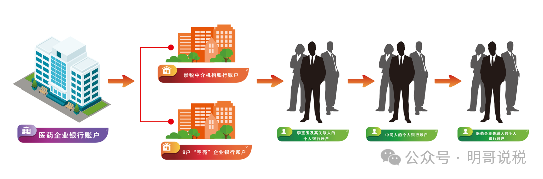 结合其他证据证实,李宝玉及其控制的涉税中介邢台汀江财务咨询有限公司,并不仅仅是表面上的独立企业,实则是整个虚开团伙的“资金中枢”与“利益分配中心”,负责统一归集来自各个空壳企业的非法获利,并进行后续操作,从而将分散的资金串联成一个指向明确的完整链条:下游医药企业银行账户→邢台汀江财务咨询有限公司和9户“空壳”企业银行账户→李宝玉及其关联人的个人银行账户→李宝玉联络的中间人的个人银行账户→下游医药企业关联人的个人银行账户。