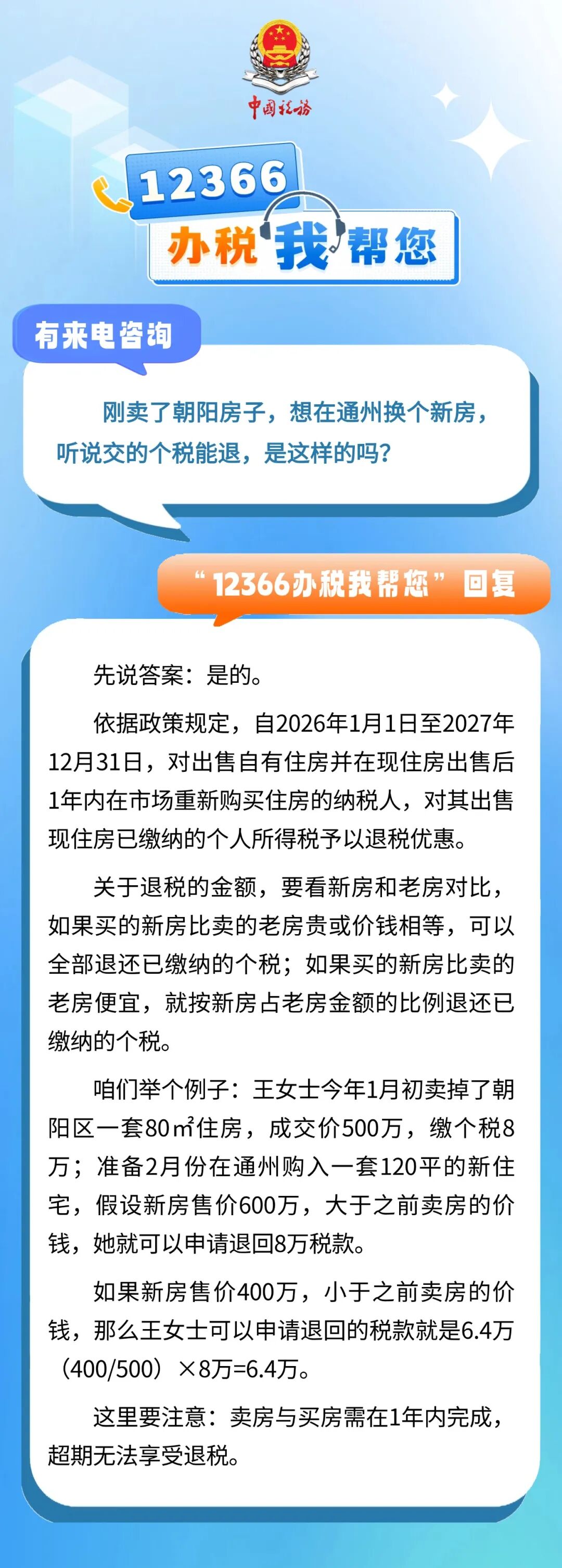 有来电咨询 :刚卖了朝阳房子,想在通州换个新房,听说交的个税能退,是这样的吗?一起来看看回复吧↓