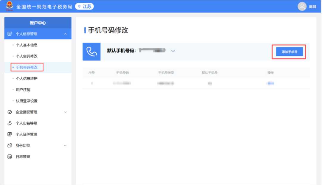 为保障业务顺利开展,请您以“自然人业务”登录电子税务局,进入 【账户中心】-【个人信息管理】-【手机号码修改】模块中添加本人使用手机号码。