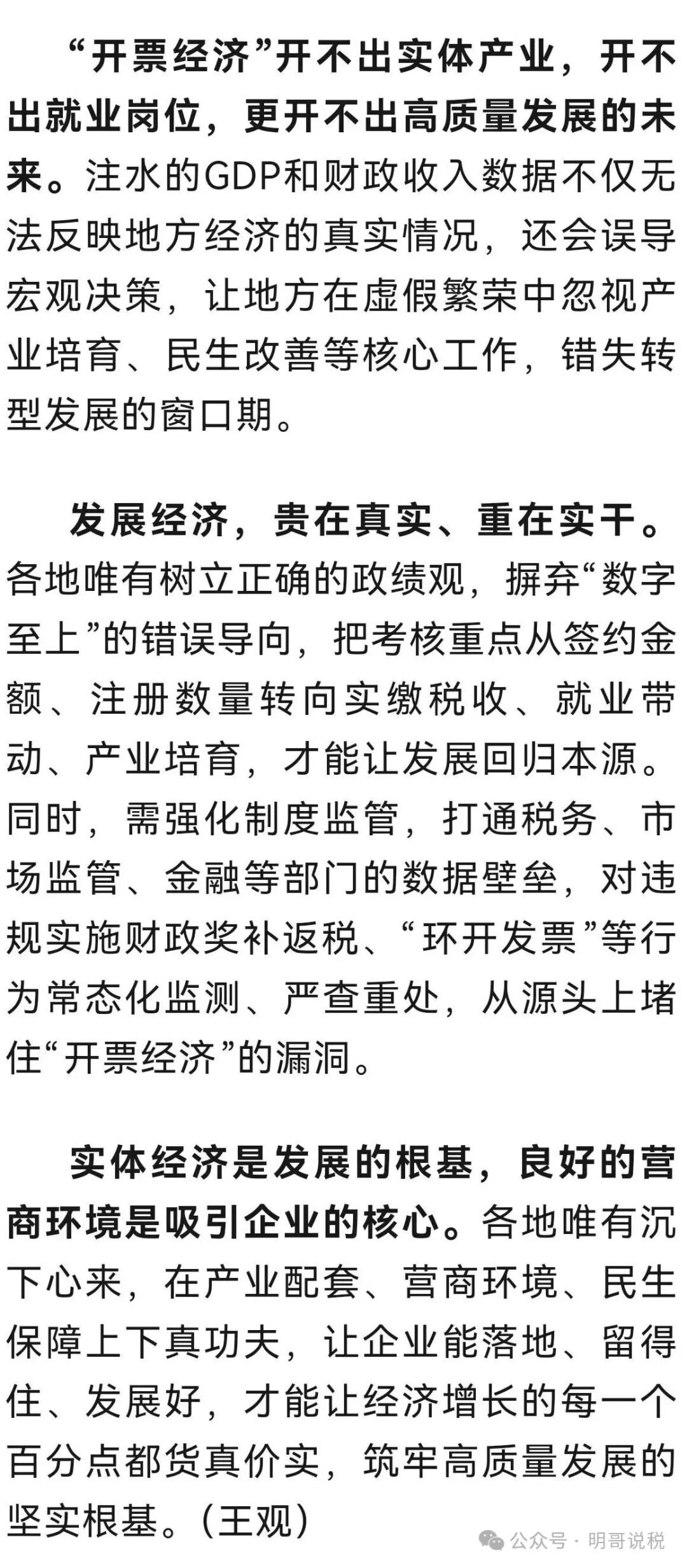 “开票经济”带来的账面热闹与真正的经济发展背道而驰,不仅无助于经济发展和就业,反而造成资源浪费,扰乱市场竞争秩序和营商环境。