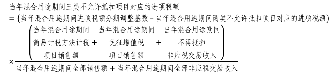 (三)计算当年混合用途期间用于简易计税方法计税项目、免征增值税项目、不得抵扣非应税交易(以下统称三类不允许抵扣项目)对应的进项税额。