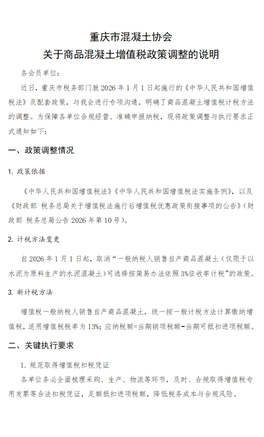 近日,重庆市税务部门就2026年1月1日起施行的《中华人民共和国增值税法》及配套政策,与我会进行专项沟通,明确了商品混凝土增值税计税方法的调整。为保障各单位合规经营、准确申报纳税,现将政策调整与执行要求正式通知如下:
