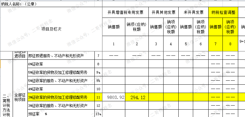 9803.92×3%=294.12元,应将其填写在《增值税纳税申报表附列资料(一)》(本期销售情况明细)第11行“3%征收率的货物及加工修理修配劳务”对应的“销项税额”一列。