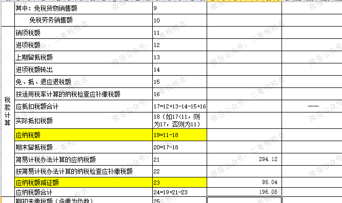 该销售额对应减征的增值税应纳税额98.04(=9803.92×1%),填写在《增值税纳税申报表(一般纳税人适用)》第23行“应纳税额减征额”及《增值税减免税申报明细表》减税项目相应栏次。